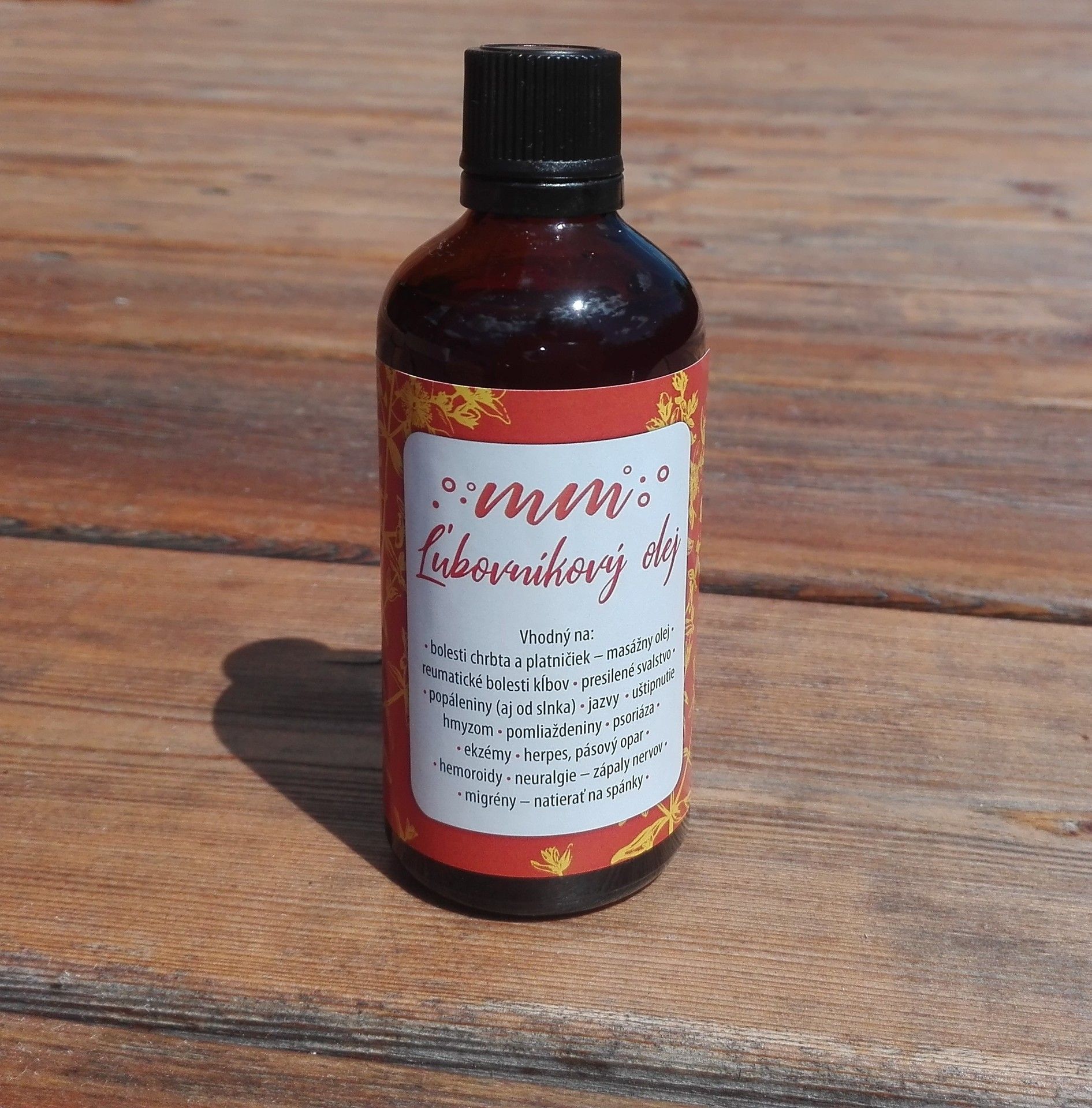 Fľaštička tohto oleja by nemala chýbať v žiadnej domácnosti. Kvet ľubovníka bodkovaného obsahuje množstvo účinných látok, najznámejšou je hypericín - červené farbivo, ktoré dáva oleju krásnu rubínovo červenú farbu.