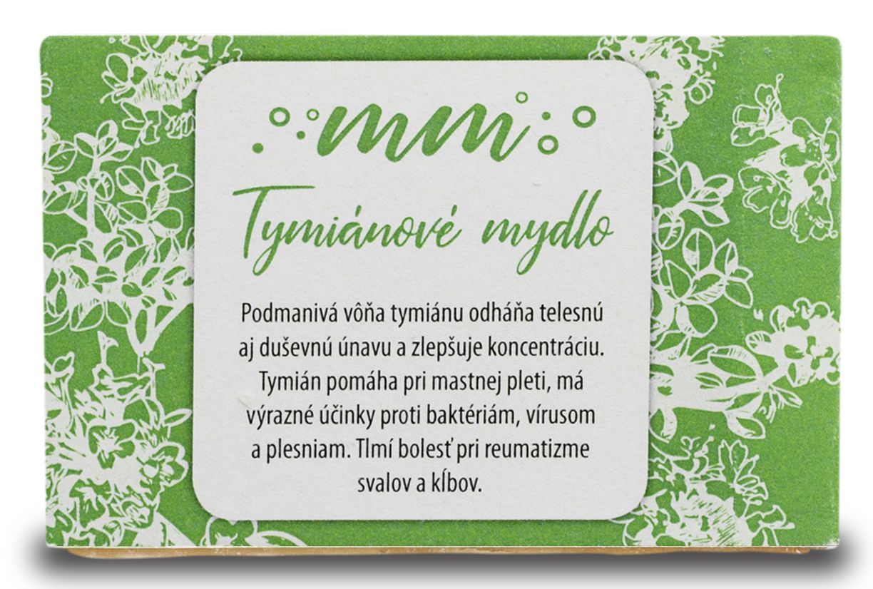 Zloženie: kokosový olej /COCOS NUCIFERA OIL/, olivový olej /OLEA EUROPAEA FRUIT OIL/, voda /AQUA/, hydroxid sodný /SODIUM HYDROXIDE/, ricínový olej /RICINUS COMMUNIS SEED OIL/, extrakt z dúšky tymiánovej /THYMUS VULGARIS LEAF EXTRACT/, silica tymián /THYMUS VULGARIS OIL/, silica vavrín kubébový /LITSEA CUBEBA FRUIT OIL/ CITRAL, LIMONENE, LINALOOL - prirodzené súčasti silíc